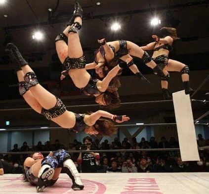 Narration : Plusieurs minutes de séquences folles de créativité in-ring sont déjà passées entre les six catcheurs : le public est chaud, il sent la fin arriver. Pentagon se fait envoyer à l'extérieur après un Dropkick de CIMA, qui en profite pour partir en Suicide Dive. T-Hawk essaye de finir ACH mais ce dernier le contre dans sa tentative de BT Bomb et exécute son combo Backbreaker-German Suplex ! Alors qu'il enchaîne avec le tombé, le jeune Gao Jingjia lui écrase le ventre avec un Springboard Double Stomp ! Fenix revient pour interrompre son tombé, puis tente un très gros Rolling Cutter mais Jingjia arrive à l'intercepter et l'envoie dans CIMA. Celui-ci exécute son Crossfire, complété par un 450° Splash de Gao Jingjia assisté depuis le dos de CIMA !